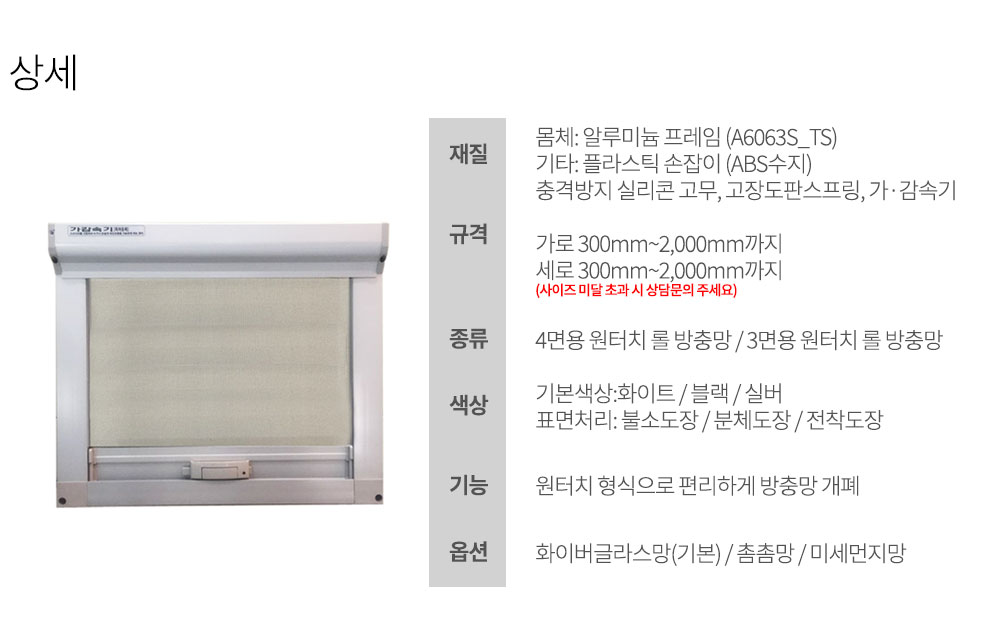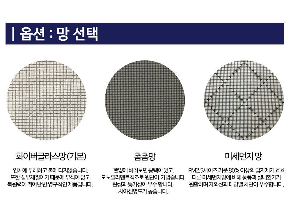스크린 롤 방충망의 장점 하자발생을 최소화 한 원터치 타입의 제품입니다. 촘촘망 / 화이트글라스망 / 미세먼지 망
